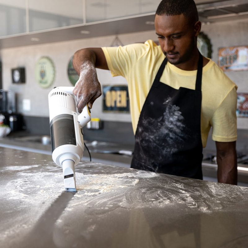 Versatilidade na Limpeza Pesada: A turbina localizada na parte superior facilita a limpeza em locais de difícil acesso, como embaixo de móveis e camas, além de alcançar áreas elevadas, como tetos e armários.