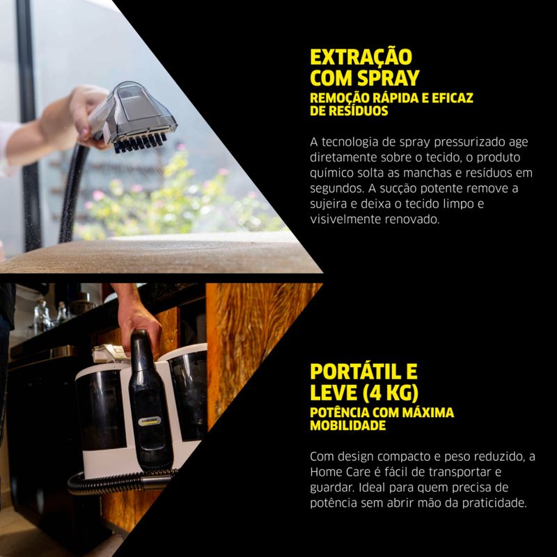 higienização de estofados automotivos, sofás, tapetes, colchões e poltronas, a Home Care combina a renomada tecnologia Kärcher com um design