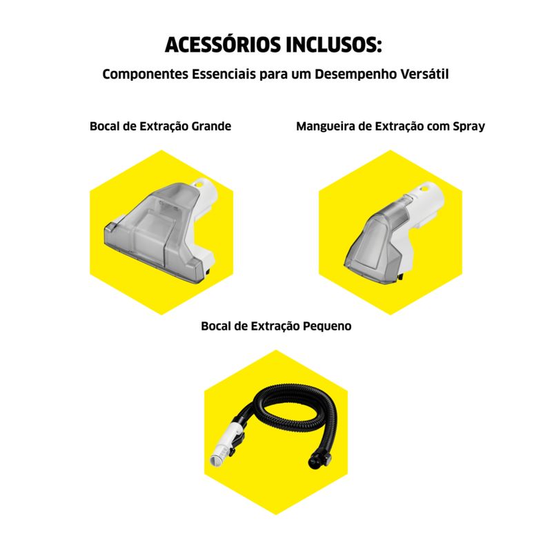 - Acessórios Completos: Inclui bocal de extração compacto e standard, além de mangueira 2 em 1 integrada com spray e sucção.