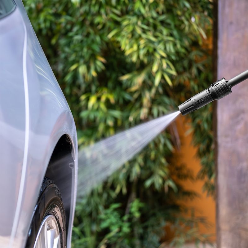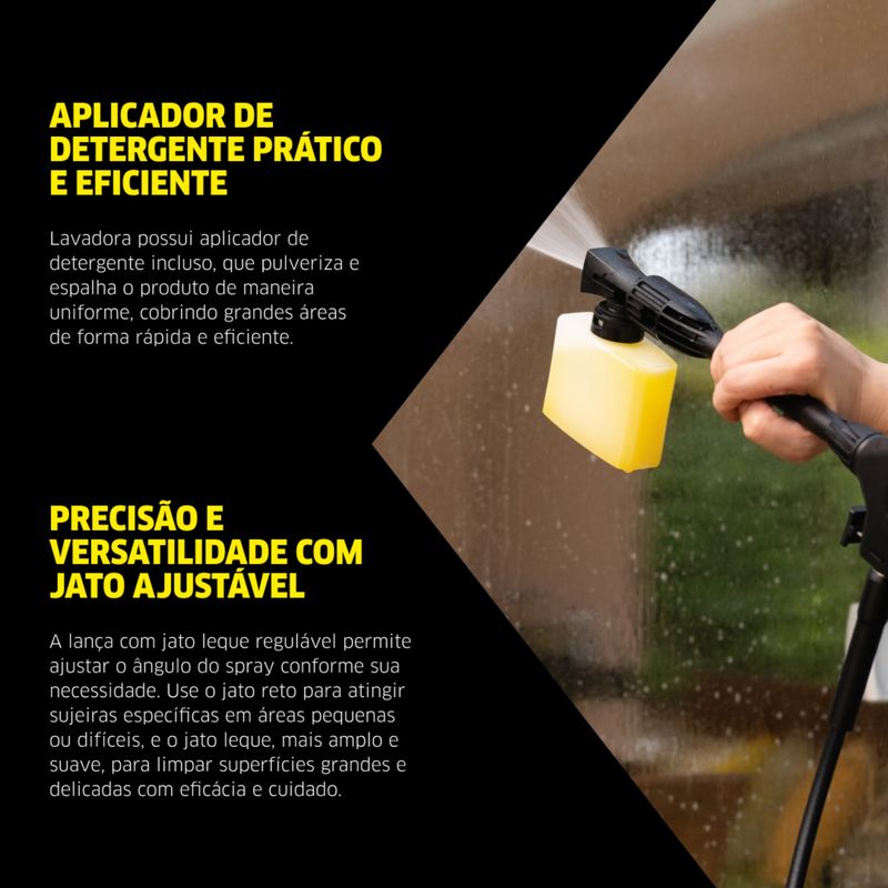 - Kit Completo e Pronto para Uso: Acompanha mangueira de 3 metros, pistola de alta pressão, lança com jato regulável e aplicador de detergente.