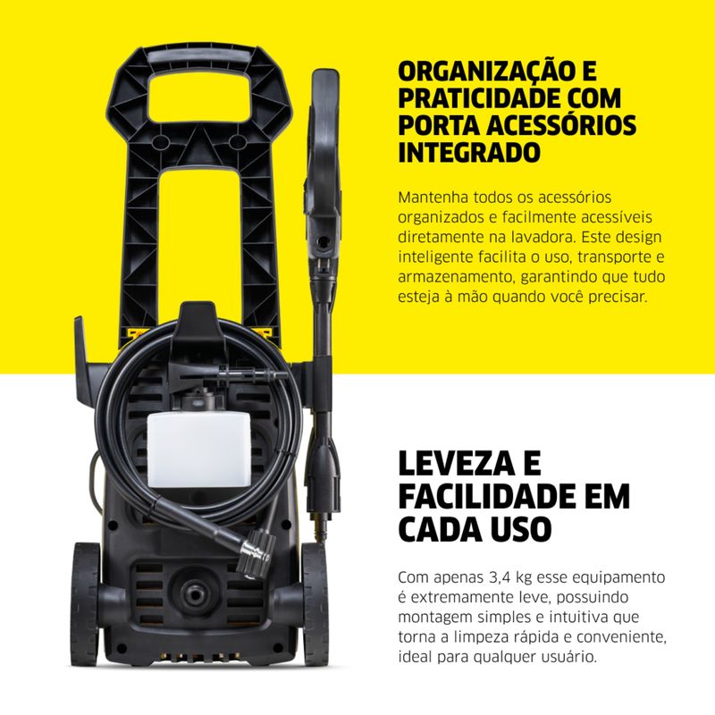 - Design Compacto e Leve: Fácil de transportar e guardar, é a lavadora de alta pressão perfeita para quem tem pouco espaço.