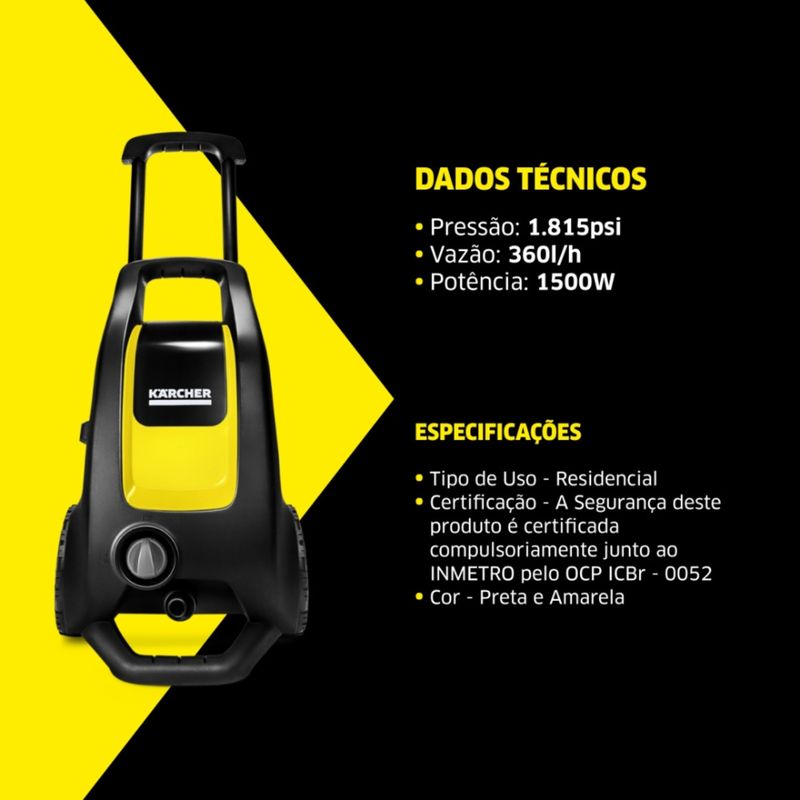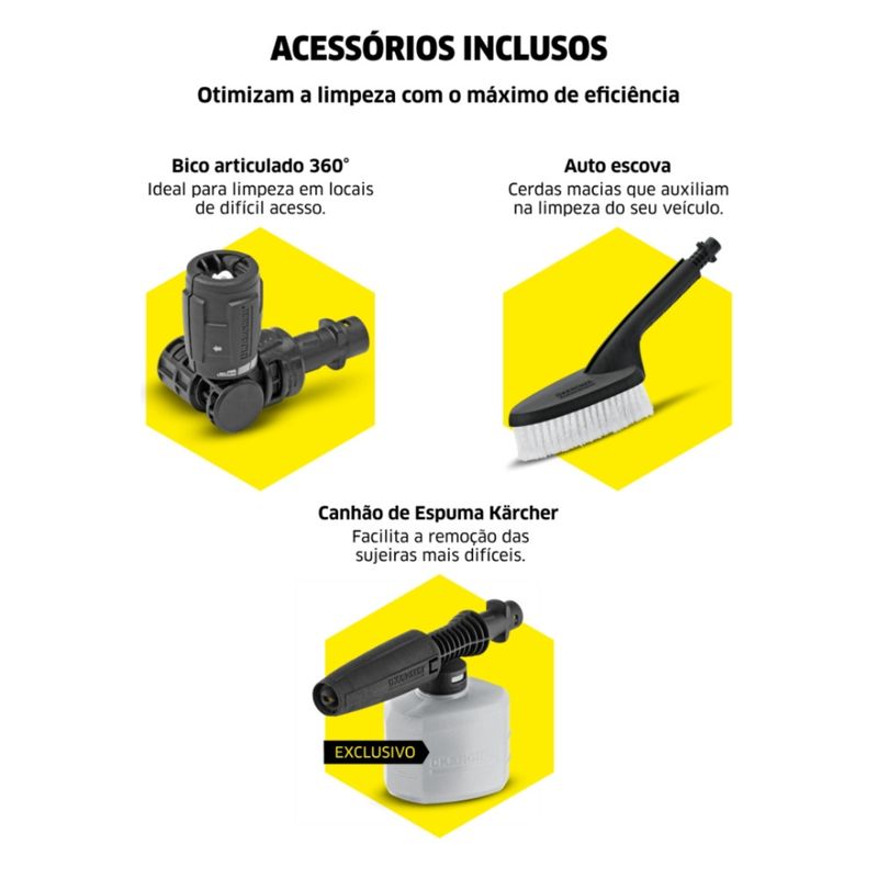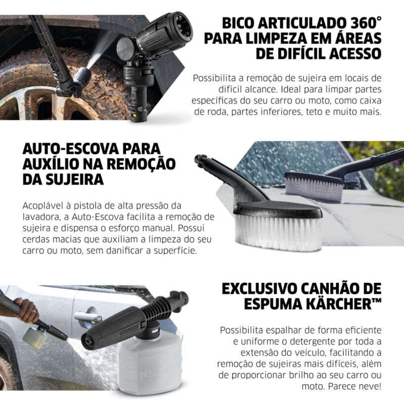 Equipado com canhão de espuma exclusivo Kärcher, bico articulado 360° e auto escova, o modelo oferece versatilidade para alcançar áreas de difícil acesso e garantir uma limpeza profunda e delicada ao mesmo tempo. Seu design conta com alça retrátil e rodas grandes que facilitam o transporte, tornando a limpeza mais prática e confortável.