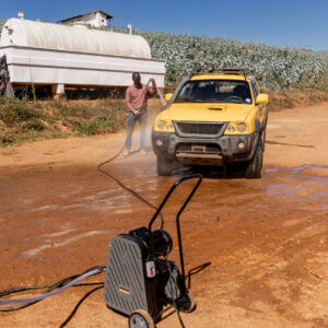 No agronegócio, limpa com eficiência implementos, chiqueiros e estábulos.
