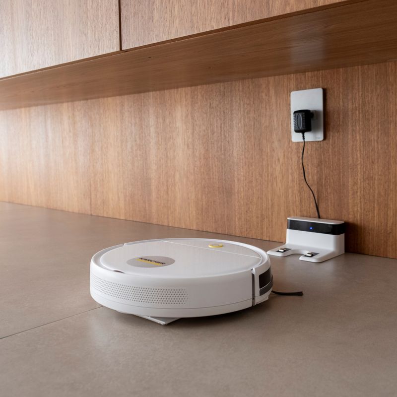 RCV 1 é um robô aspirador 3 em 1 que varre, aspira e passa pano seco, garantindo limpeza eficiente e prática para sua casa. Com design slim de