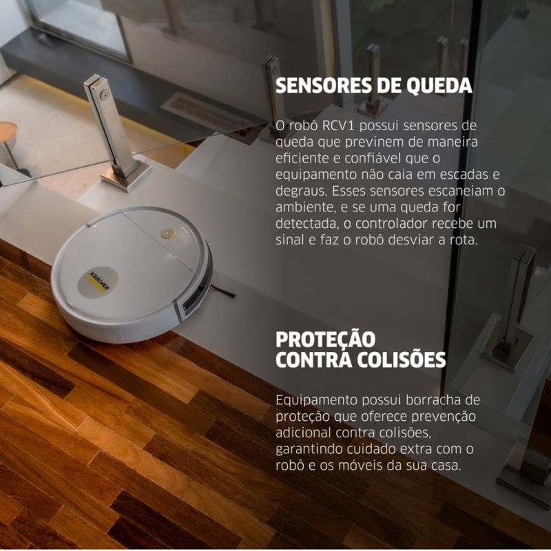 7 cm, ele alcança facilmente embaixo de móveis e sobe degraus de até 10 mm. Ideal para donos de pets, remove pelos e sujeiras de todos os tipos de superfícies. Possui escovas laterais duplas, sensor anti-queda e de colisão, controle remoto para seleção dos modos de limpeza e depósito de pó de